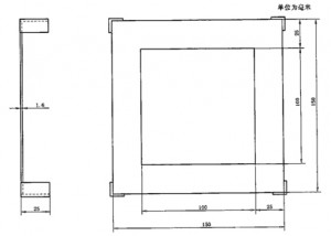 c) 試樣支架及安裝板:支架用于樣品的定位,安裝板規(guī)格為150mm×150mm,厚度1.6mm,中間有一個100mm×100mm的孔,每個角垂直焊接一個6.5mm高的角鐵。