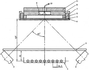 a) 熱源:包括一個輻射熱源和兩個對流熱源,輻射熱源使用一組9個T-150的紅外石英燈管,放在水平放置樣品的正下方一定距離,對流熱源使用兩個點火器,對稱放置在樣品下方,且與樣品中垂線成45°角。