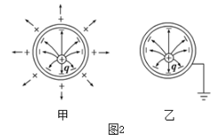 如圖2甲導體殼沒有接地時,處于內部電場中,達到靜電平衡,導體殼內外表面出現等量異種電荷,殼內外表面之間場強處處為零,殼外場強不為零.導體殼接地后,如圖2乙所示,導體殼外的正電荷被大地負電荷中和,正電荷出現在地球的另一端無窮遠處,導體殼內外表面之間及導體外部場強處處為零,導體外部空間不受內部電場影響.