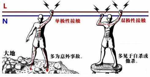 雙極性接觸觸電:即人體同時接觸火線與零線,形成回路,而無需經(jīng)過大地,所以此時絕緣鞋不起作用,這種觸電情況多為自殺或他殺,發(fā)生機(jī)率很小。